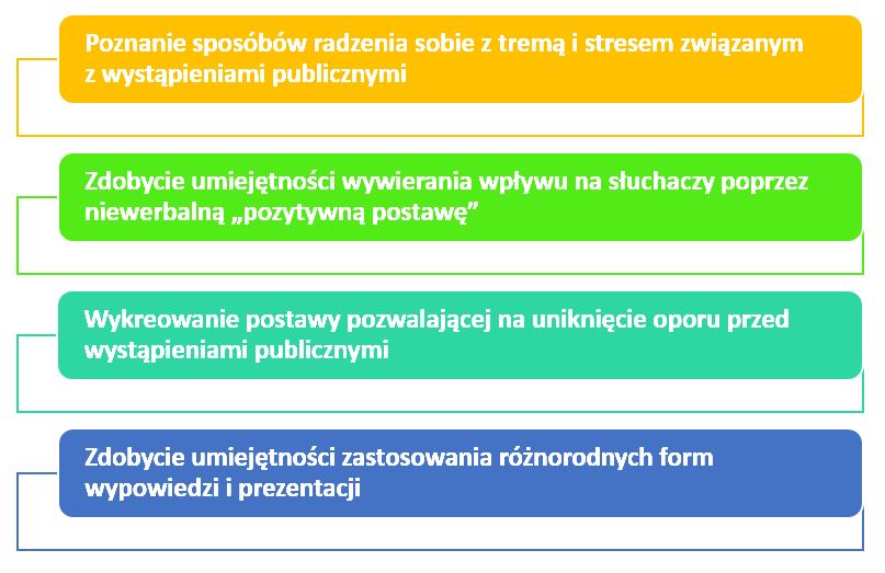 dostarczenie wiedzy oraz doskonalenie umiejętności wystąpień publicznych i profesjonalnej prezentacji oraz panowania nad stresem i zmianami w sytuacjach trudnych.